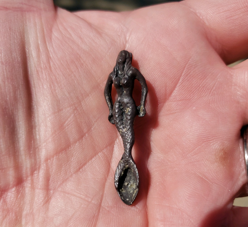 While working just below the high tide mark I got a banging high tone. The item was deep and with other beachgoers looking on I pulled out a silver mermaid. She was very tarnished but still very beautiful.