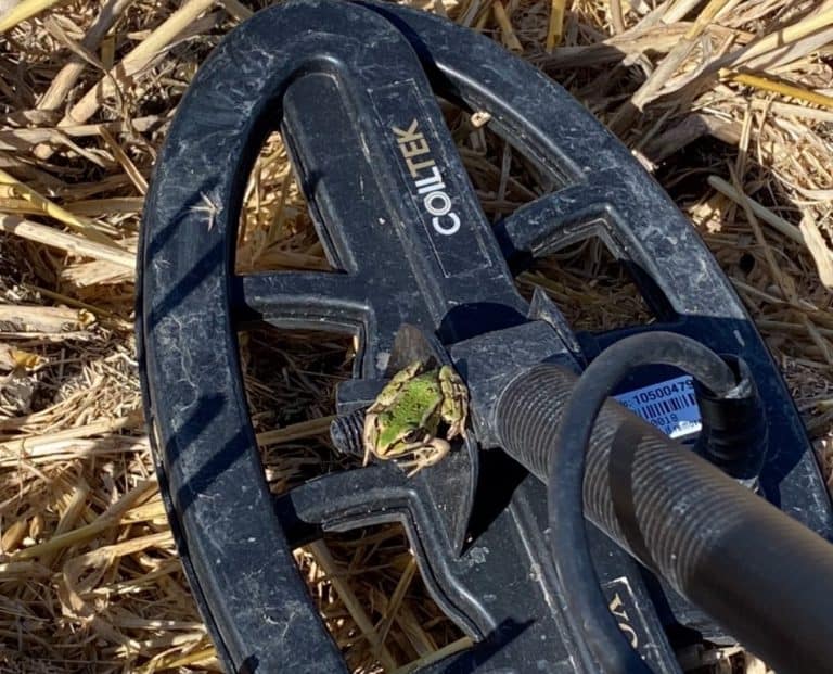 After a while detecting a frog jumped on the Coiltek coil attached to my metal detector. It looked as if it waited for me to take a picture and then jumped off and went on its way.