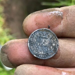 So, I set away took a few steps and started to find bits of lead, scrap and the usual stuff, got a bit further and got a nice high signal, reading 22-23 I dug down about 8’’ to reveal a dark black silver sixpence, of Queen Victoria. dated 1842 it was in near perfect condition.