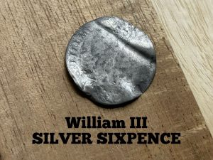 I got a bit further and found some pennies and half pennies and then got another signal, this time it was faint. Reading 17, I dug down about 12’’ and revealed a King William III sixpence, turned into a love token. What a relic/ coin to find! The coil was working a treat, picking out the targets with ease.
